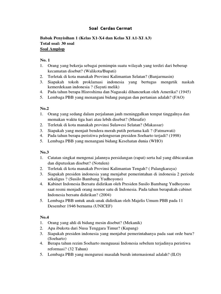 Pada tanggal 6 agustus 1945, bom atom dijatuhkan oleh pasukan amerika serikat di atas suatu kota di jepang yang berpengaruh terhadap menyerahnya jepang terhadap sekutu. Soal cerdas cermat pengetahuan umum posted on january 22 2015 by kabar infarul ghoy tritunggal babat 1. Soal prediksi ulangan kenaikan kelas matematika tingkat smp kelas 8 tahun 2014 waktu 120 menit pilihan 1. Soal pkn dan kunci hubungan internasional dan organisasi internasional. Siapakah nama kepala desa sesaot ?